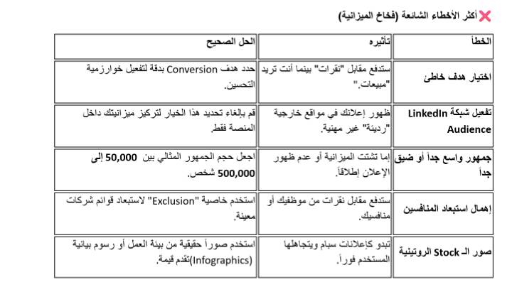 نصيحة ياقوت وزمرد: لا تبدأ حملة “تحويل” (Conversion) في لينكد إن بميزانية إجمالية أقل من 15,000 ريال شهرياً، لأن الخوارزمية تحتاج لبيانات كافية لتحسين الأداء والوصول لأقل تكلفة ممكنة للعميل المحتمل.